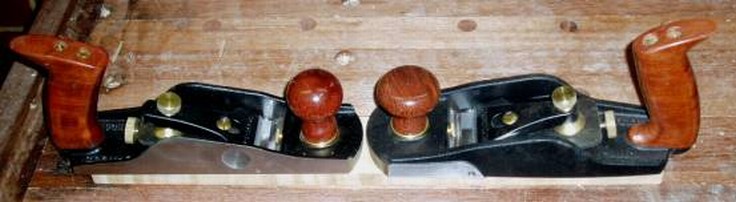 What of the front knob? The mushroom knob of the BUS is very comfortable easy to hold. It reminds me a little of the low Stanley knobs of the Type 11 and earlier era. The front knob of the LAS is smaller and more akin to modern Stanley knobs. It is also comfortable. Why are knobs round? Probably because this permits them to be held at different angles. Why does the BUS have a larger knob that the LAS? Probably because it is heavier and requires extra leverage to lift at the end of a stroke. The knobs meet different needs in different circumstances. In my opinion they suit the planes they are on.