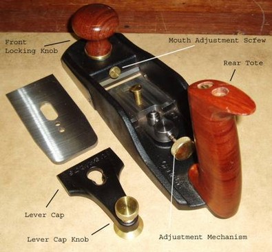 A substantial front knob and rear tote. The rear tote has double bolts for additional rigidity, compared to traditional bench planes such as the Stanley, which use only one bolt.