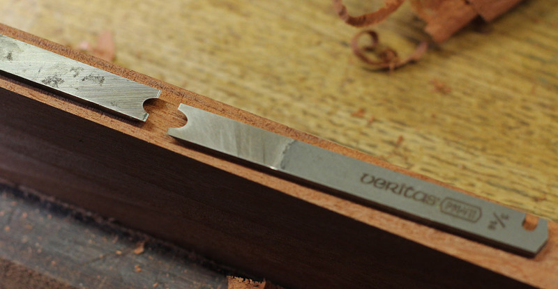 OK, so here is the plan: I would use a Stanley #45 beading blade of the same size as the guinea pig. This is identical in thickness to the Veritas blade, just longer. The extra length means that I cannot use the adjuster, and will need to set the depth of cut by hand. What will be different about this blade is that it will receive a 15 degree backbevel. That will create a 60 degree cutting angle! A high cutting angle of this magnitude no longer requires a mouth to control tearout.
