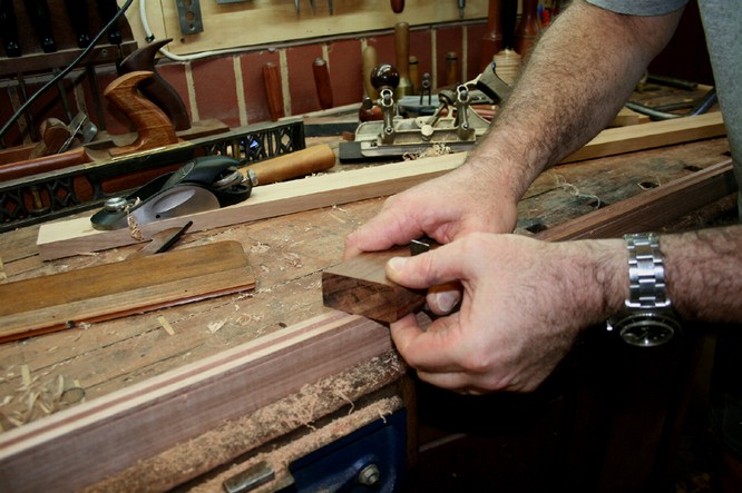 Step one was to test out the Plow on a scrap of Makore (left over from a recent build). I was interested to see what type of finish I could get using a slightly interlocked grain but one with grain that was mainly predictable.