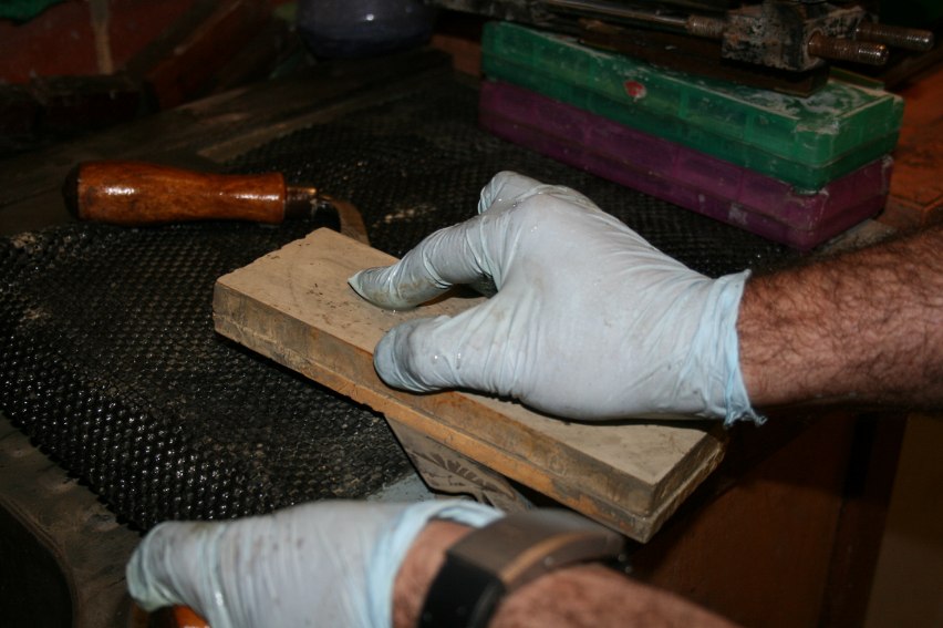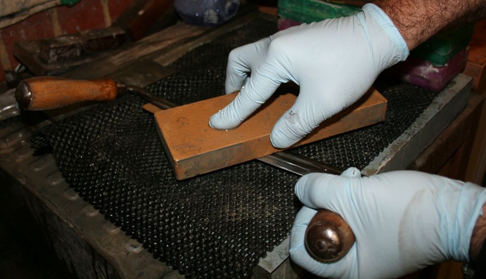 Make sure that you keep your finger high up on the stones and well out of reach of the blade! Only push forward, and never pull the stone back towards the blade!!