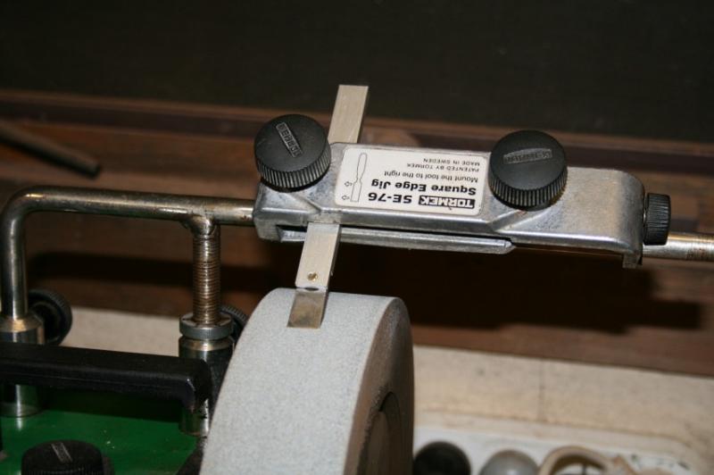 The blade head is attached to a holder. This enables it to be treated as a common plane blade. Here it is set up in a Tormek. It could as easily be ground on a high speed dry grinder.