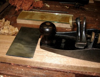 Behind the blade is my carbide burnisher. In front of this is the glass setting plate I use for woodies and scraper planes.