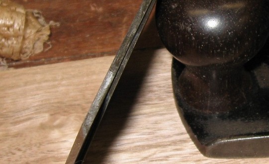I needed a thin blade, so decided to make one out of a piece of saw blade that was the right size and hardness. The big belt sander is a great tool – hardly ever been touched by wood, I use it for grinding metal. The steel was flattened, and both blades were honed up to 8000 on a Shapton waterstone. The thin blade was given a primary bevel of 35 degrees while the LN continued with its 30 degrees. Both blades were slightly cambered ala a smoothing plane. Both blades were given a fine hook with a thin carbide rod I use as a burnisher.
