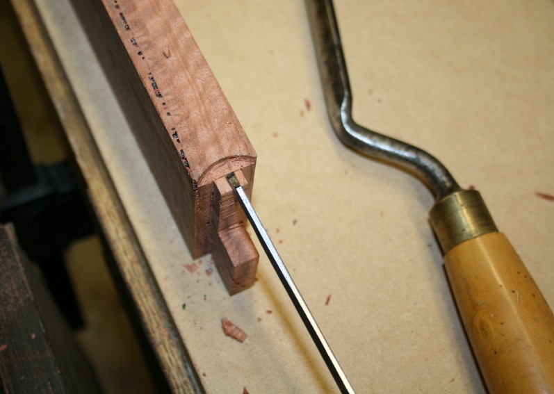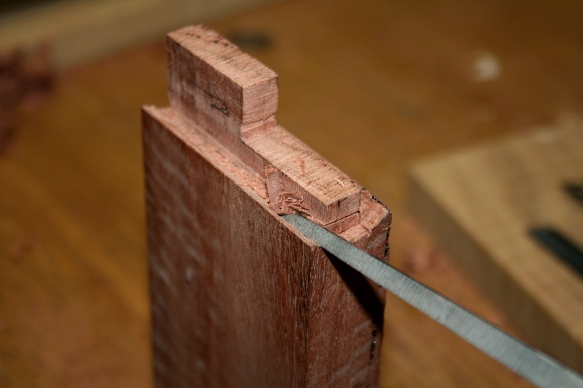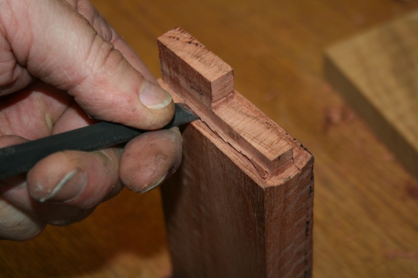 By far the most useful chisel for this process was a 1/8” bevel edge bench chisel. It was used to help remove the waste from the end (below), and along the shoulder (see later).