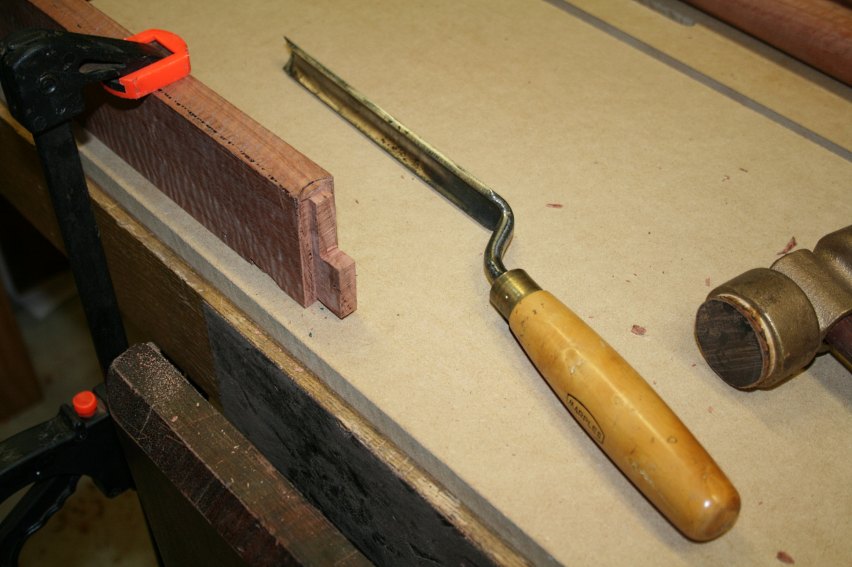 The coped ends must be left unmodified, however the waste along the cheek can be removed a little deeper than the coped ends. The 1/8” chisel made quick work of this.