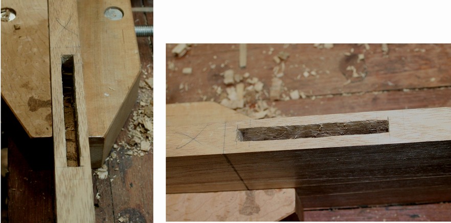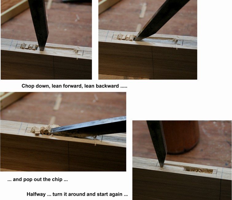 There are a number of different ways to attack the mortice. Some choose to work from the centre outwards. Some choose to start on one side and work across to the other side. I choose to work halfway from the outside inward, then turn the work around and do this again.