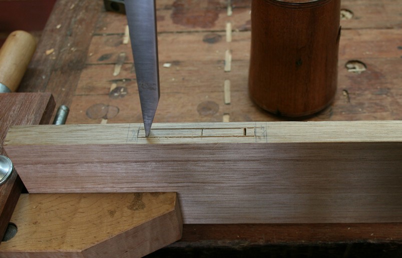 I like to first pare out the surface of the mortice. This makes it easier to keep the first deep strikes in line with the edges.