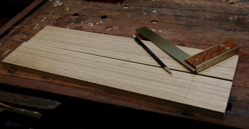 Step one is to transfer your dimensions to the boards, and leave an inch or two of ear beyond these marks. This is to prevent the mortices blowing out. The ears will be cut off later.