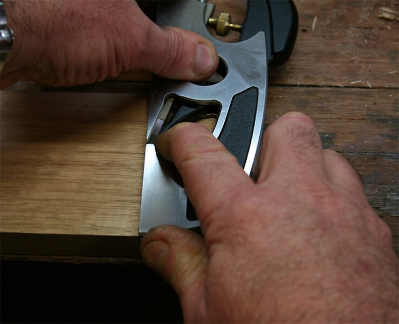 … can be done with a chisel. One does not need more than this if you have terrific hand skills. Nevertheless, there are a few tools that make the job easier for the more ham-fisted, such as me. A router plane will level and ensure that the tenon cheek is parallel to the stretcher. A rabbet block plane can remove a lot of waste quickly. A joinery rasp fine tunes the thickness. And a shoulder plane trims and tunes the tenon shoulder.