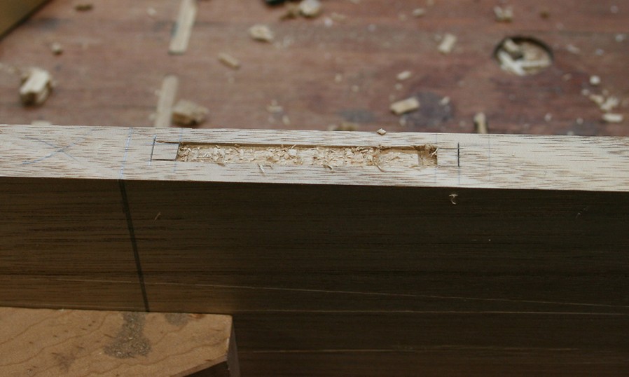 The first incisions are made 1/8” – 1/4” in from the end of the mortice. Chopping to and levelling chips from the end of the marks will result in severe bruising. Rather work slightly inside the lines and leave the bruising there. The plan is to pare away these sections at the end and finish the mortice with clean, square ends.