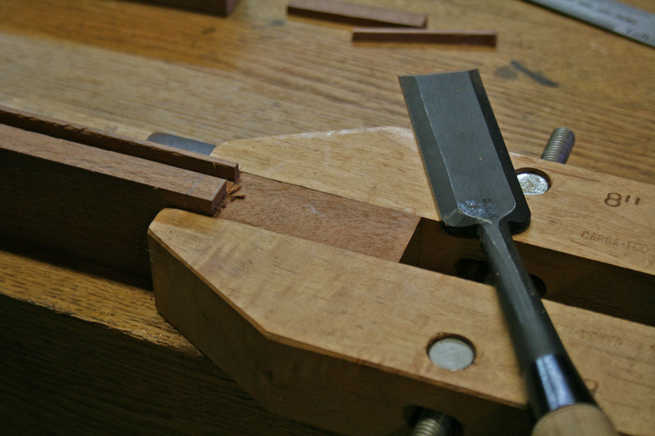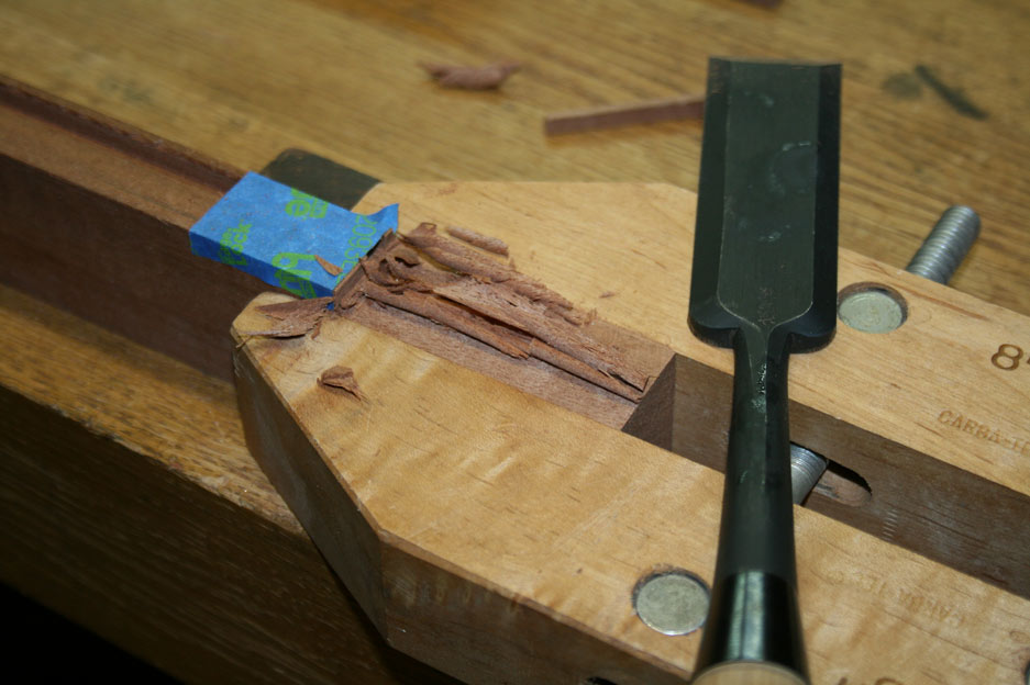I had this bright idea to use a wooden clamp to provide a parallel paring surface for removing the waste in preparation for the mortices. I had last used this technique to saw the shoulders on a chair with a curved rail.