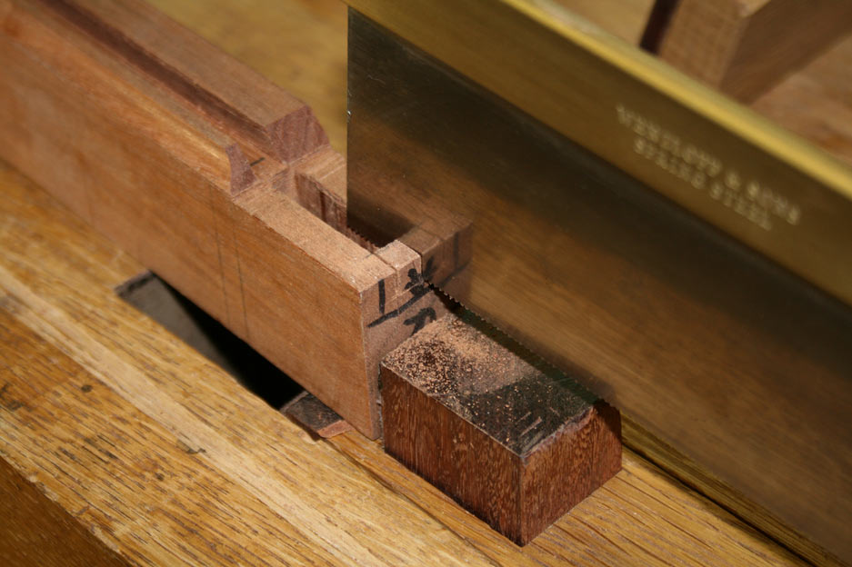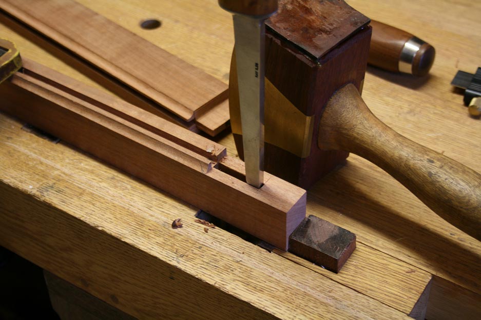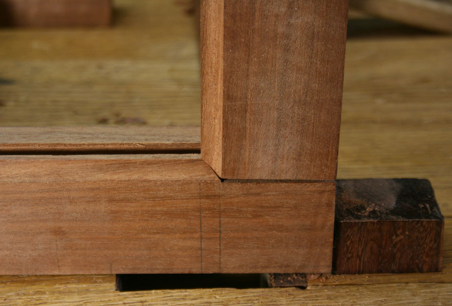 Firstly, the mitres are added to the two sections, and then these are fitted together. Obviously, basic work first needs to be done on the tenons to fit the mortices, such as leveling the tenons (I used a router plane), and cleaning up the shoulders (I used a chisel).
