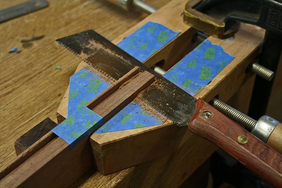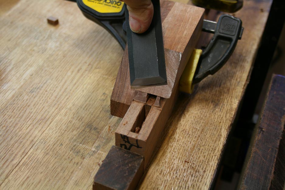 Here the mitre is being pared with the aid of a guide.