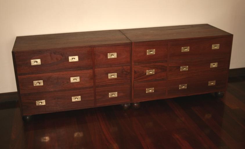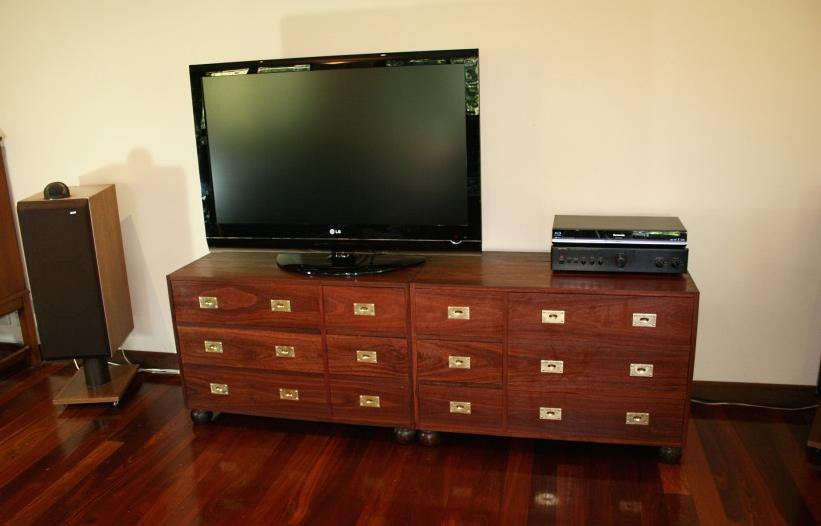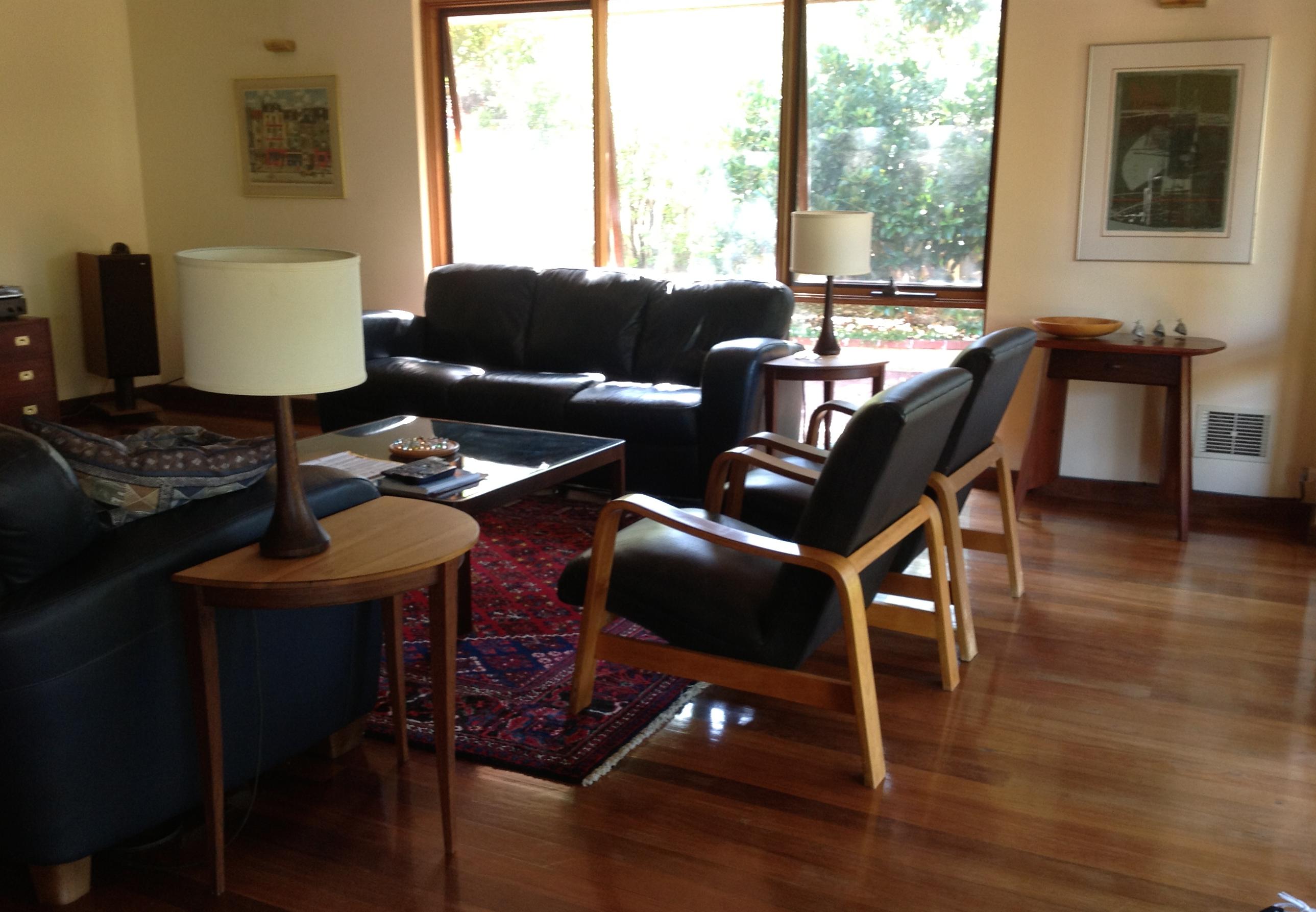 Taken circa 2012 – demilune tables, turned side lamps, coffee table, side table (far right), and two chairs designed by dad.