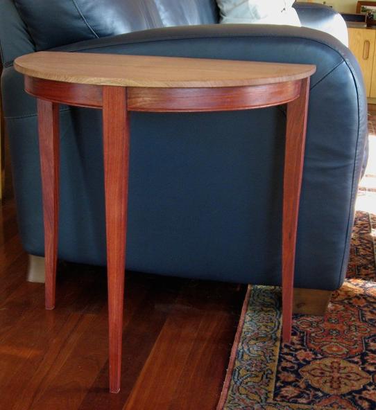 One of a pair of demilune side tables in Jarrah and Tasmanian Oak