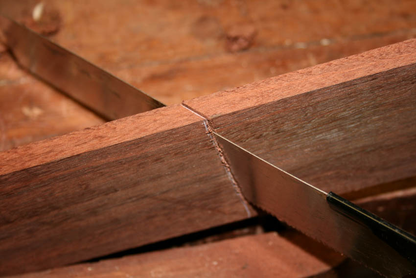 There were a number of compound mitres in this piece. I found that it was easier to scribe the angle and cut them with a handsaw.