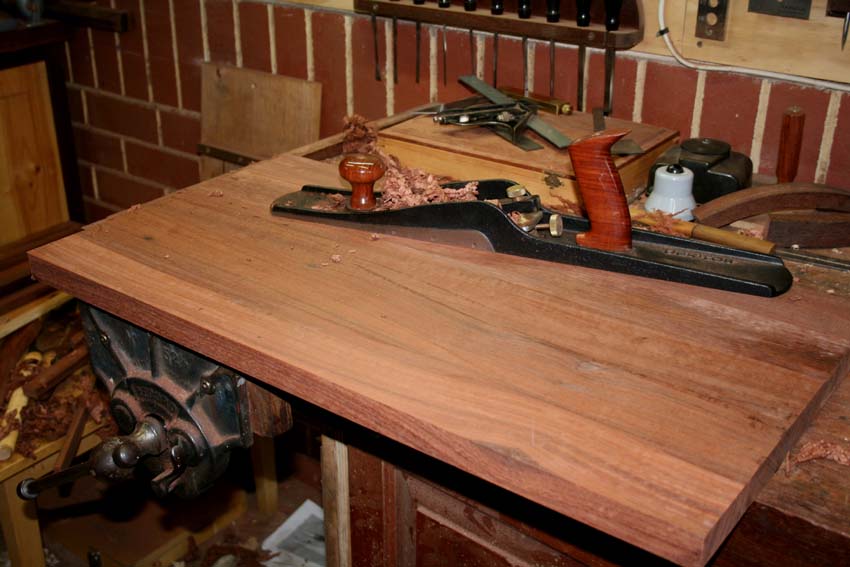 While the glue dried on the carcase I started planing the top. This is 1 ¼” thick Jarrah made of five jointed segments.