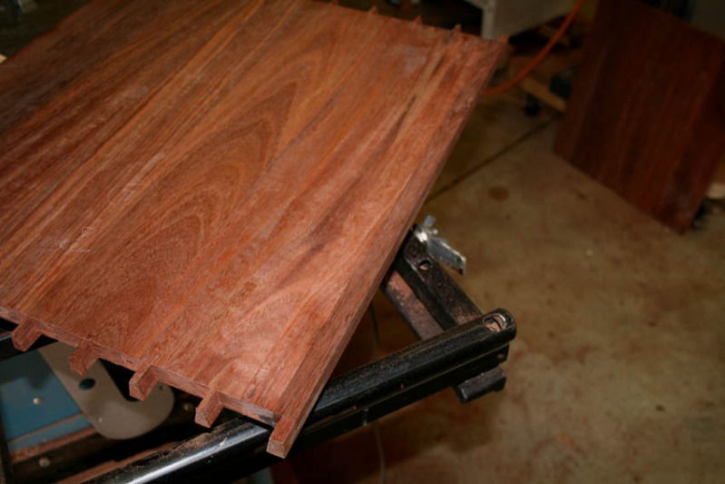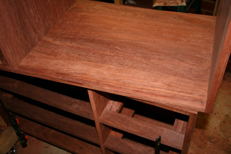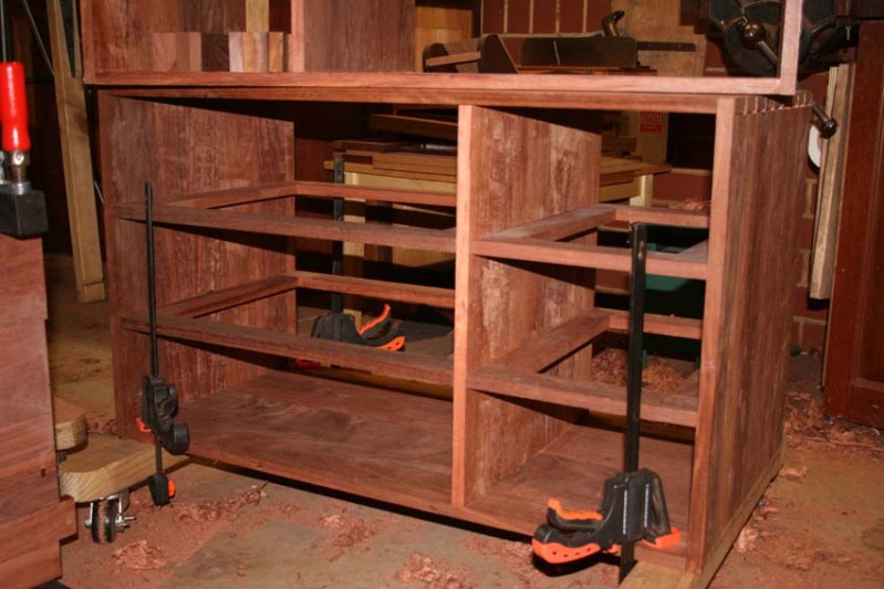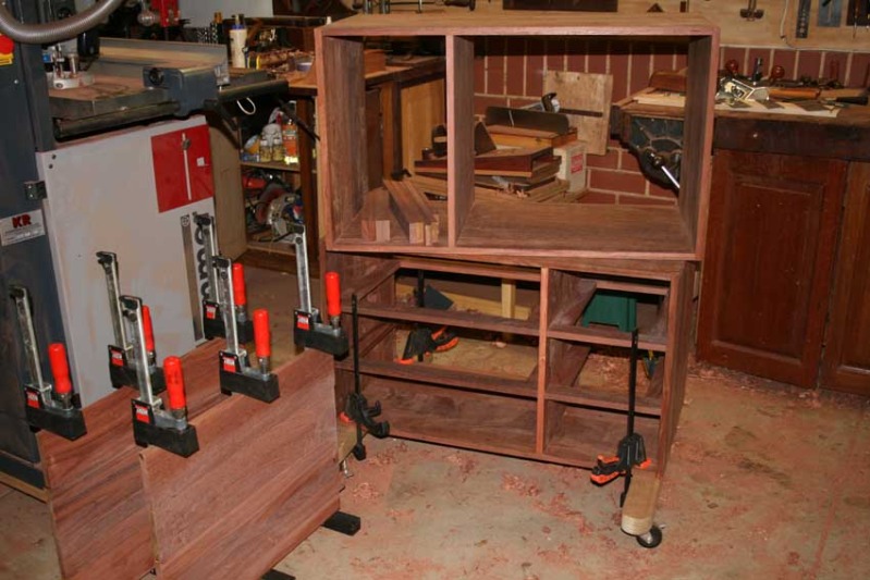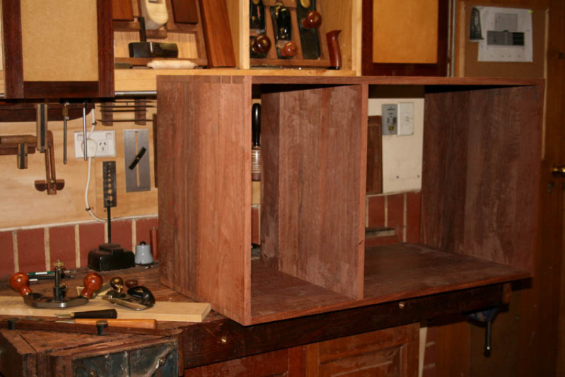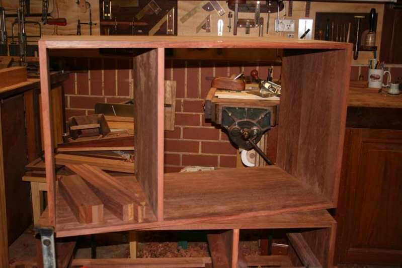 Where I had left off last time was this - two carcasses in Jarrah dovetailed together with centre divider. These are 900mm x 525mm each, and will make up a long, low cabinet 1810 in length.