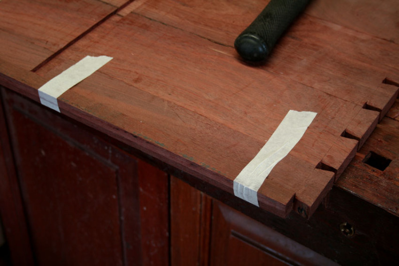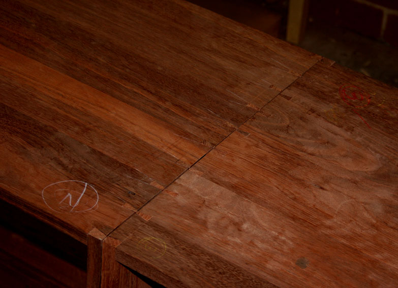 Here is a picture of the dovetailed cabinets placed edge-to-edge. You can just barely see the writing. You can see the poor markings ..