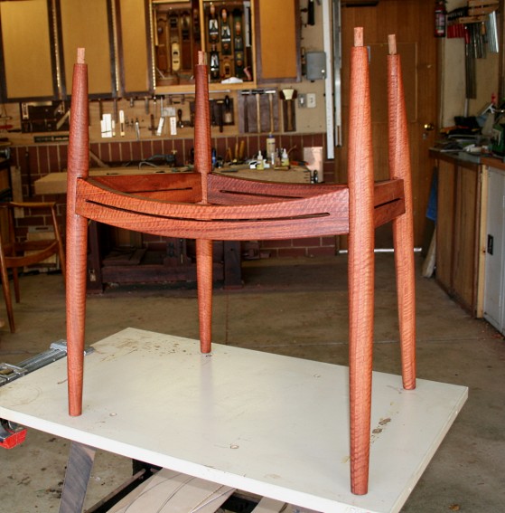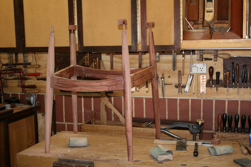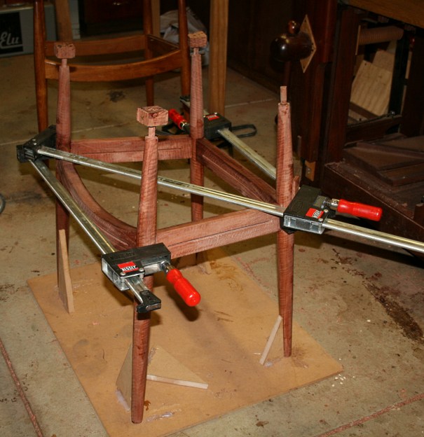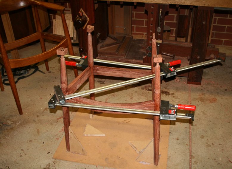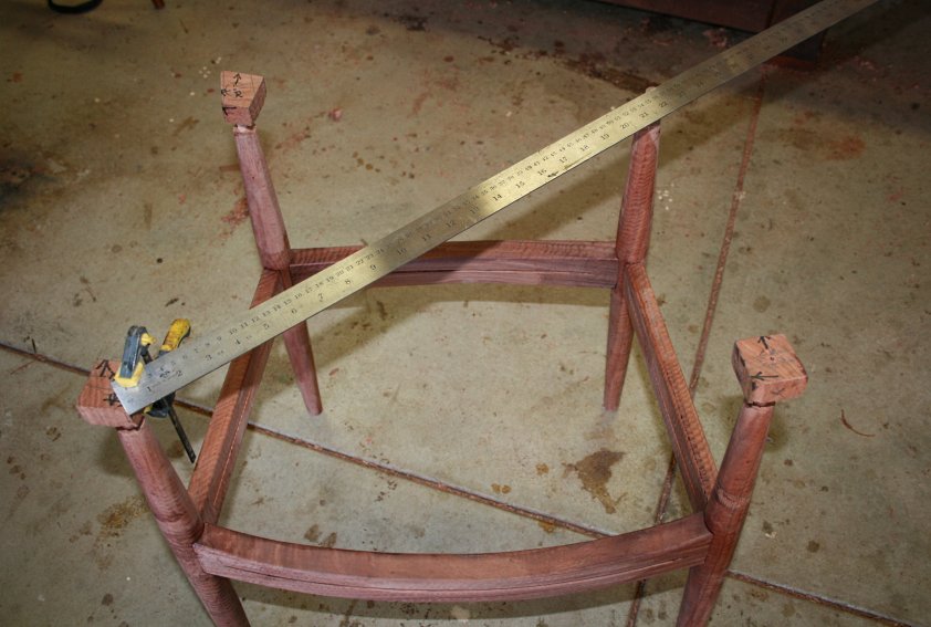 Below is the final stage, where the sides are done and now the front and rear stretchers have been added. The joints look tight. A clamp has pulled the legs/seat onto square. This is checked across the diagonals – perfect!