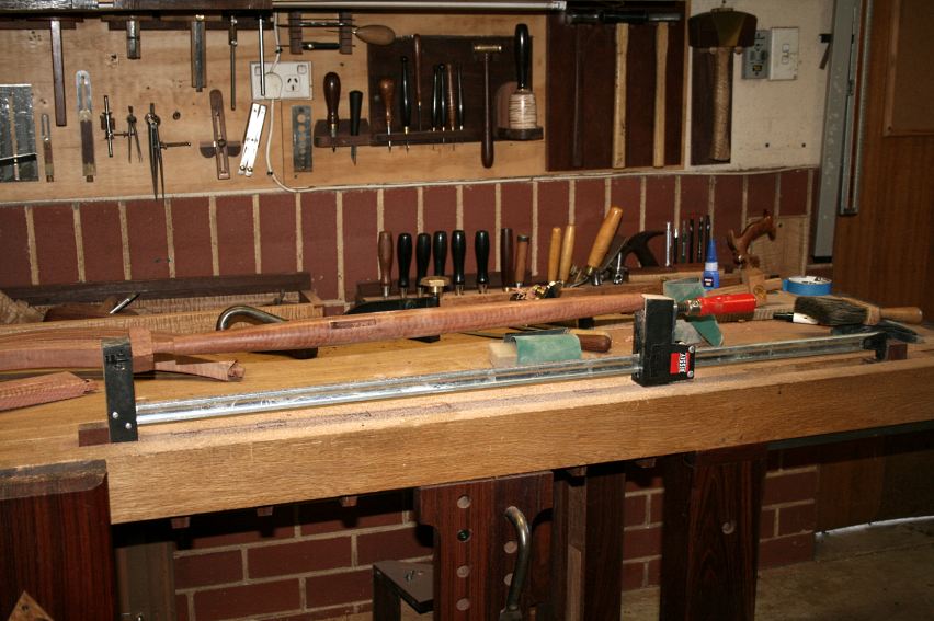 For sanding the legs I recalled a method using an F-clamp in a face vise by a carver friend, and modified this for sanding the legs by securing a clamp in the tail vise …