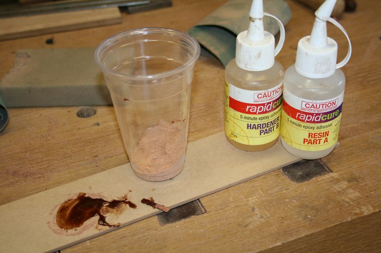 During the first sanding session I had taken the opportunity to collect some of the dust. The plan was to use this mixed with quick set epoxy to fill and chipped off corners.