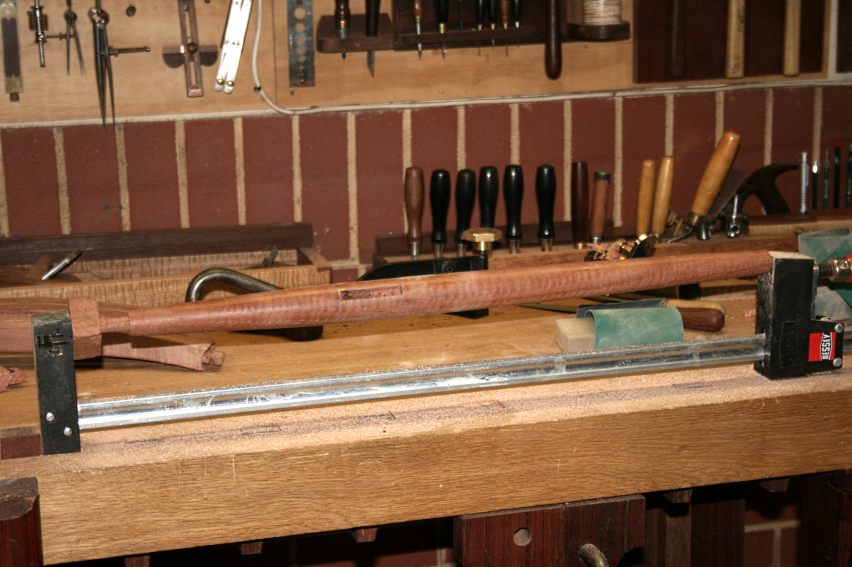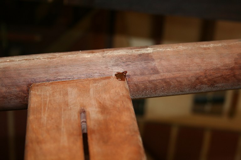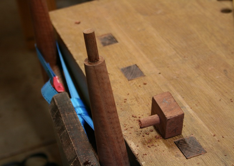 At some point one of the sides fell over and the tenon at the top broke off. Damn! I really did not need this extra work in my life at this time. Deep breath … turn a dowel on the lathe, drill and fit … all good as new …