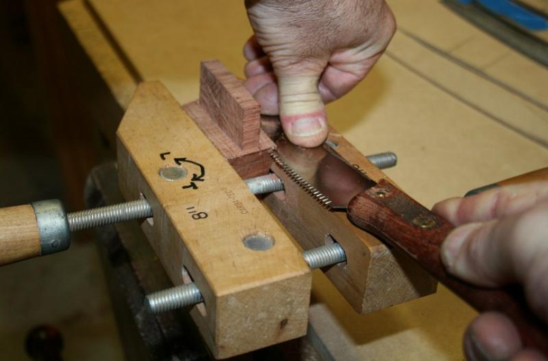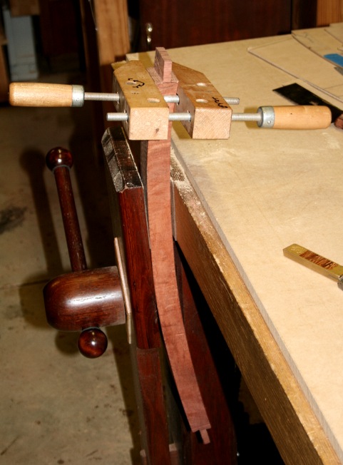 If I was to build a dedicated vise, the clamp/jaws would be narrow to minimise the effects of a curve. The hand screw here was sufficiently narrow for this task.