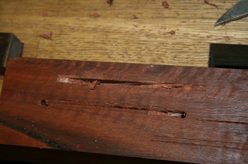 My first thought was to saw it out with a coping saw and then clean up the edges with a rasp and file. I practiced on a scrap and decided that this would require too much cleaning up. The saw blade tended to wander with the grain, and the through mortice was too narrow to saw two parallel kerfs.