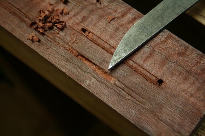 In this wood a single blade cutting gauge was not reliable. Even with initial light passes, the blade wandered with the grain enough that the mortice was in danger of wandering off course or widening. A mortice gauge would be better, but I did not feel like making one with the correct fence specifically for this project.