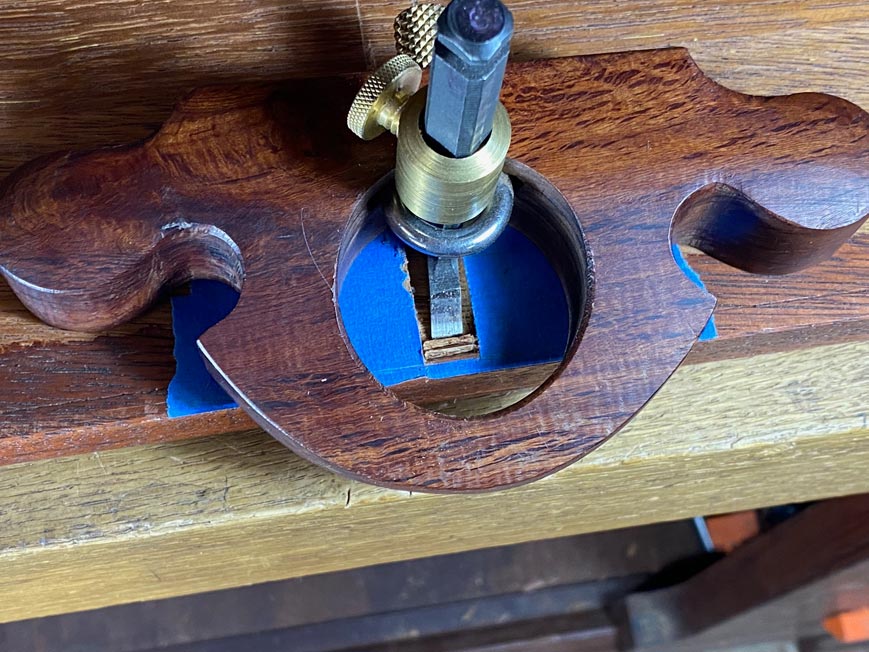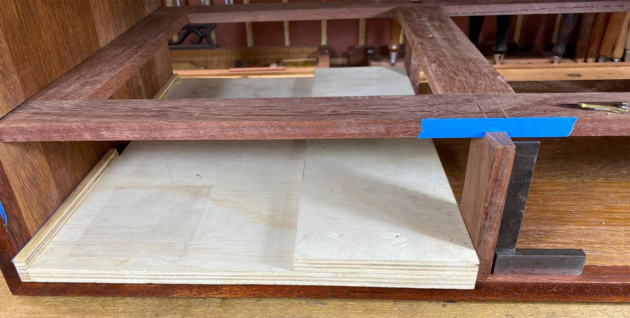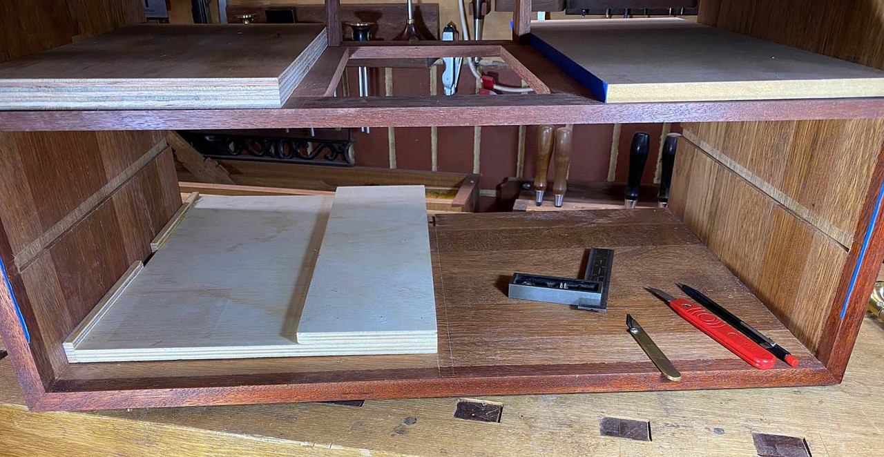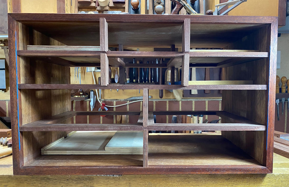 The single lower- and the two dividers need to be fitted into a sliding dovetail ... however, unlike the dividers at the rear, this must be from inside the case. In other words, a blind sliding dovetail.