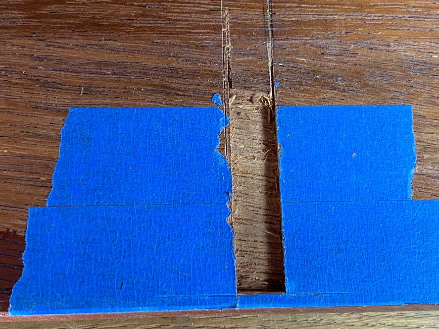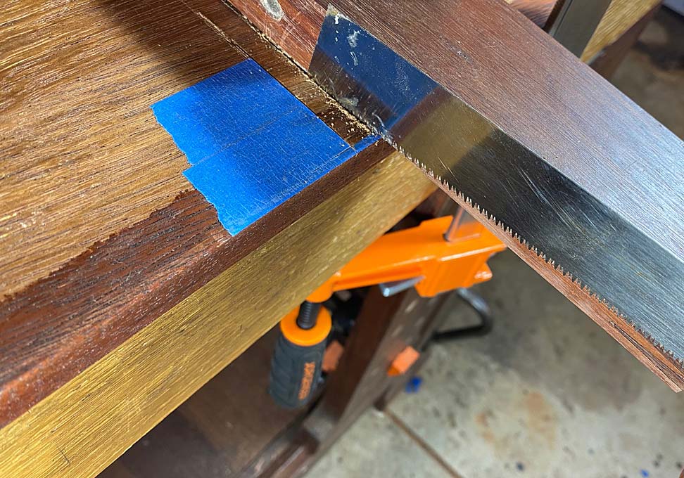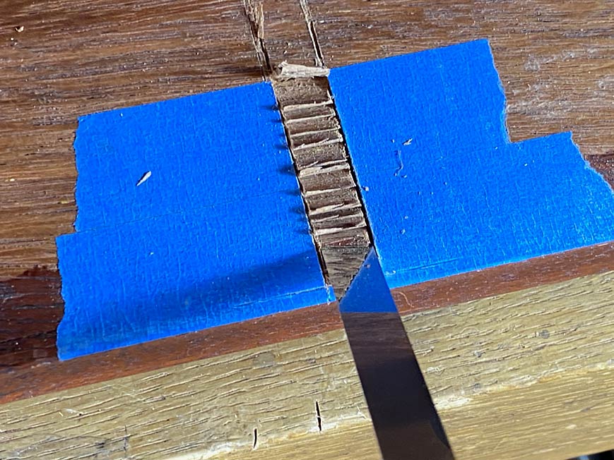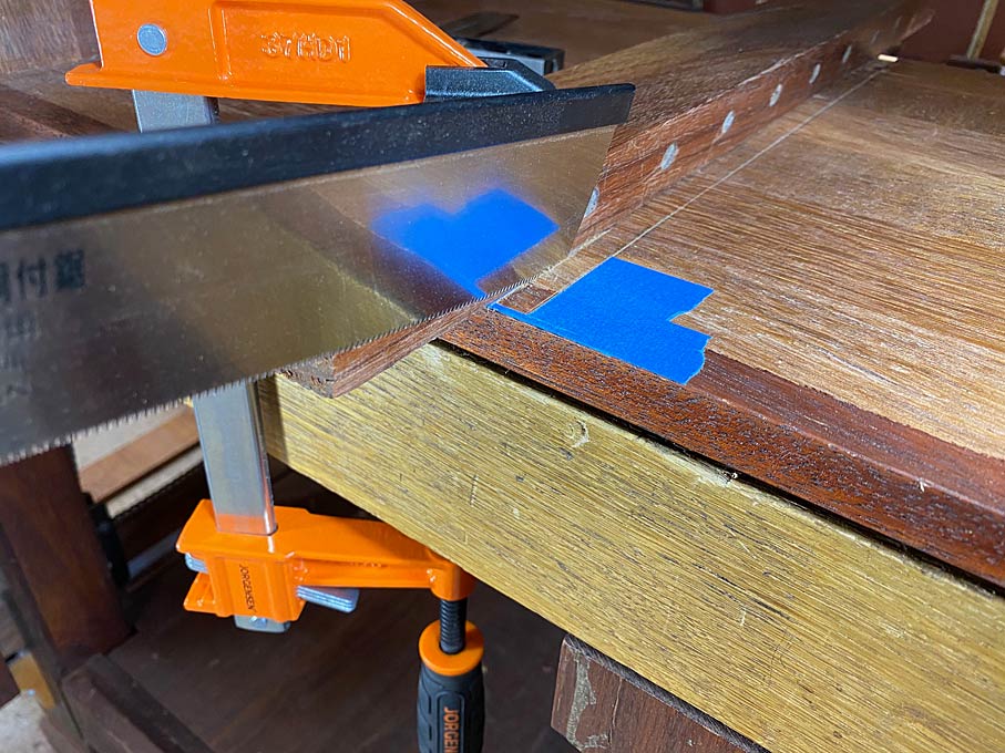Very carefully, using the dozuki, saw about 5mm from the boundary line. Be careful not to get closer than this. Saw marks must not show outside the dividers.
