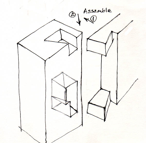 “Here's a sketch of essentially the same thing, what I call a 'slot and slide dovetail housing', or it could be called a 'drop and slide dovetail housing'. I can't remember how often I've used this form of sliding dovetail, but it can't be more than maybe two or three times”.