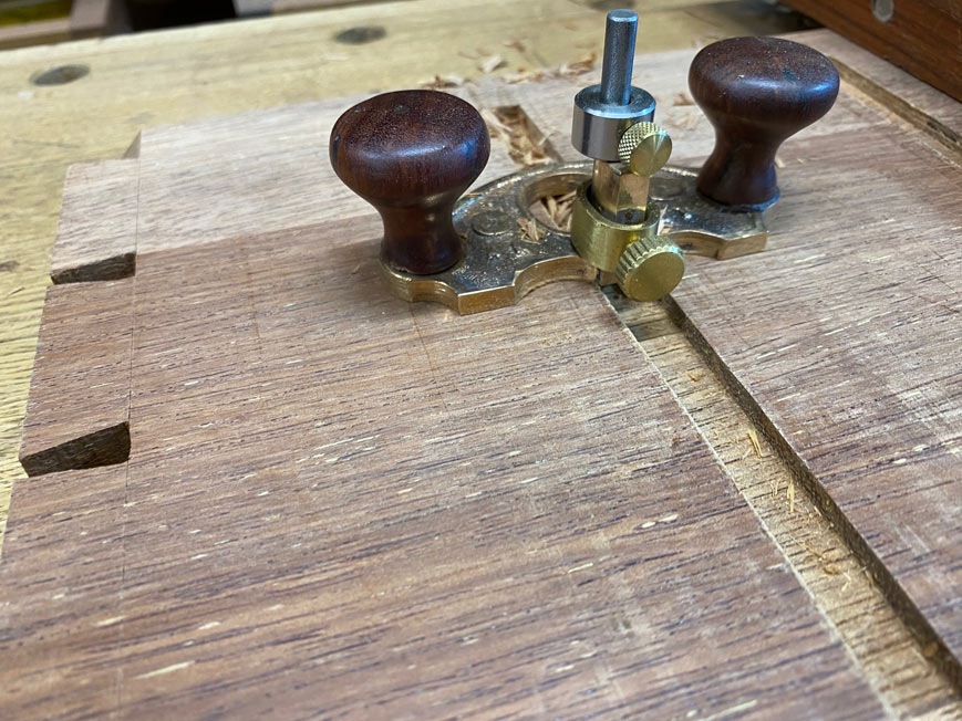 Any waste in the corners is removed with a side rebate plane (this is one from Veritas). be careful not to remove waste from the upper edge as this will change the position of the dado. The side rebate plane is the only plane which can plane along the inside edge of a dado or groove, to increase the width.