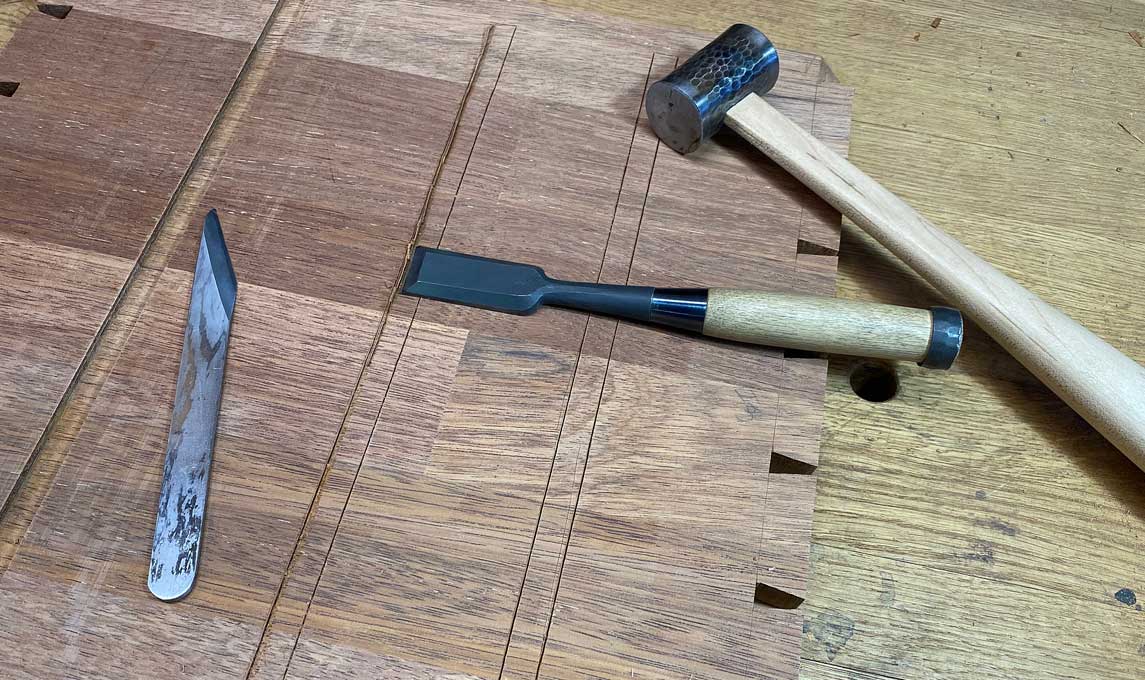 The knife lines are deepened and undercut with a chisel to create a wall for a saw ..
