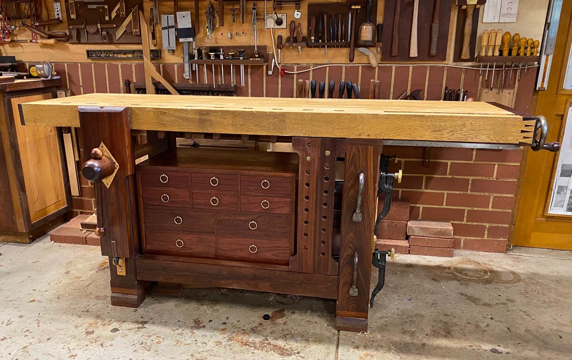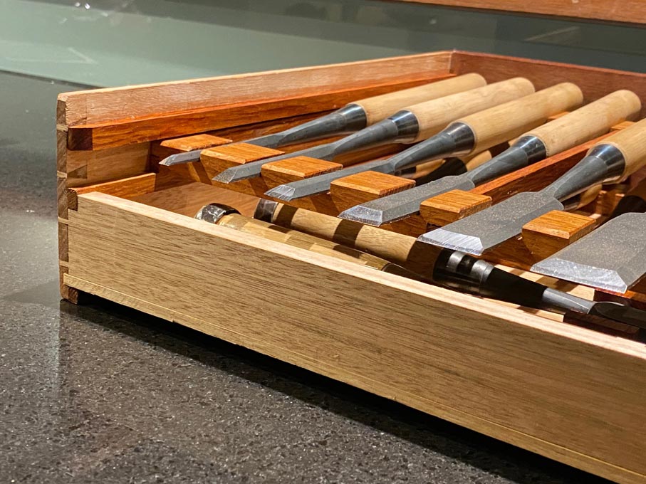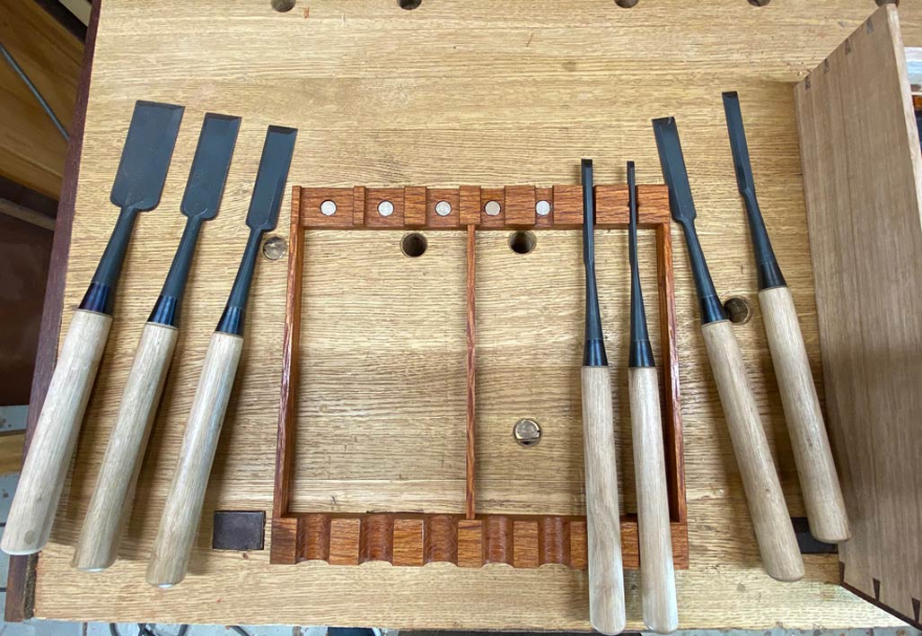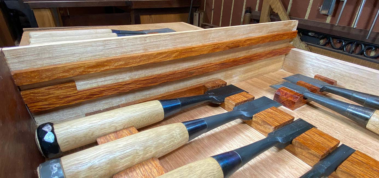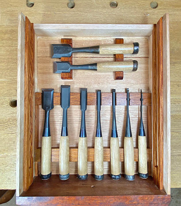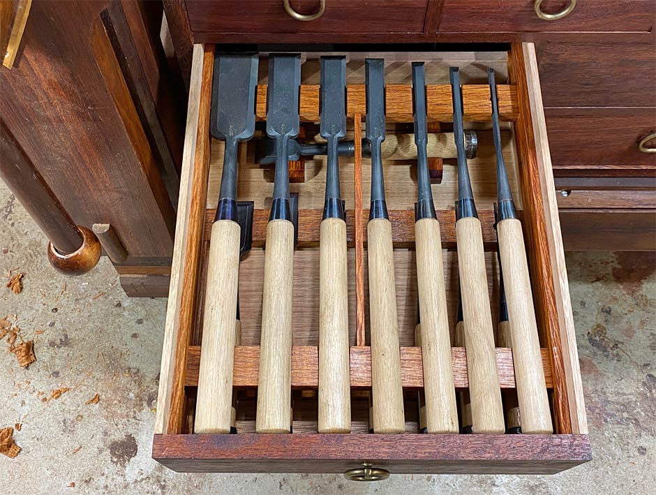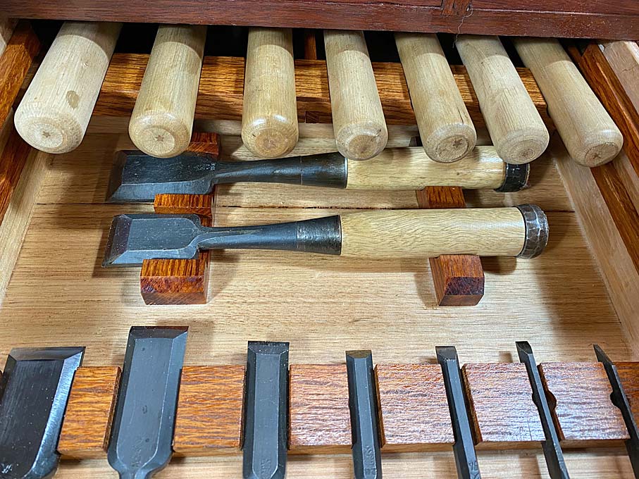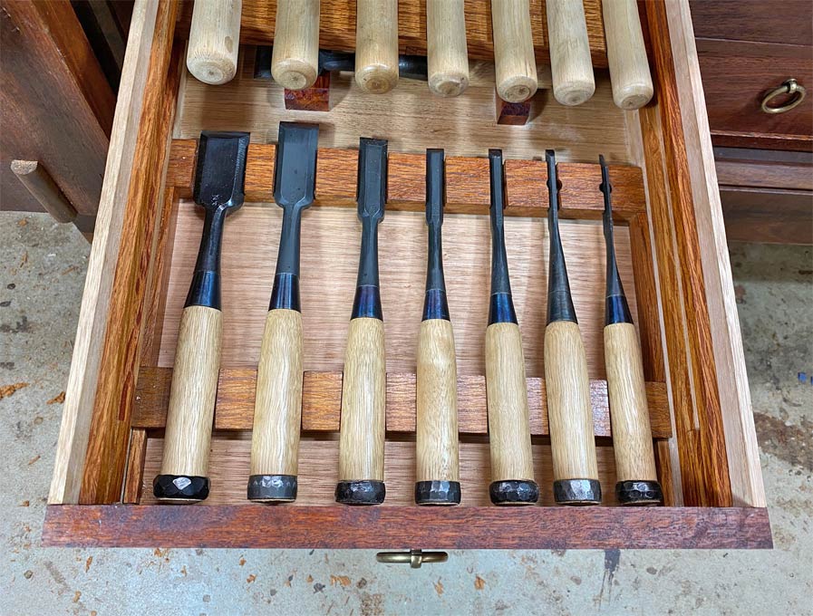 The drawer holds my Kiyohisa chisels: paring slicks and bench oire nomi. It is important to be able to find, and extract them easily when working at the bench.