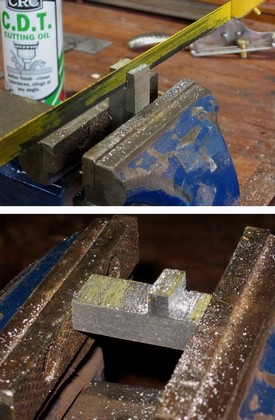 Mark off the waste and remove this with the hacksaw. Note, these dimensions are not critical. I eyeballed everything and cut as close to the line as possible. The only important dimension is the tenon. This must fit snuggly inside the slide.